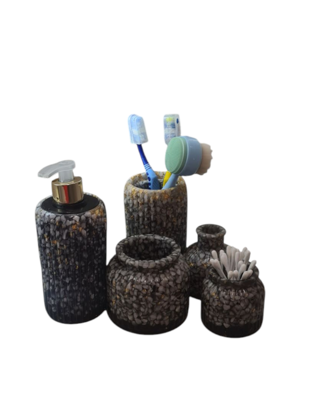 این ست شامل جامایعی +لیوان برای قرار دادن مسواک +جاصابونی +بانکه سایز بزرگ برای قرارگیری پدهای آرایش پاکن یا پنبه +بانکه کوچک برای گوش پاک کن یا خلال دندان +گلدان کوچک برای قرار دادن گل یا خوشبوکننده است که درکل شامل 6 محصول است که به صورت ست بهداشتی قابل سفارش میباشد.