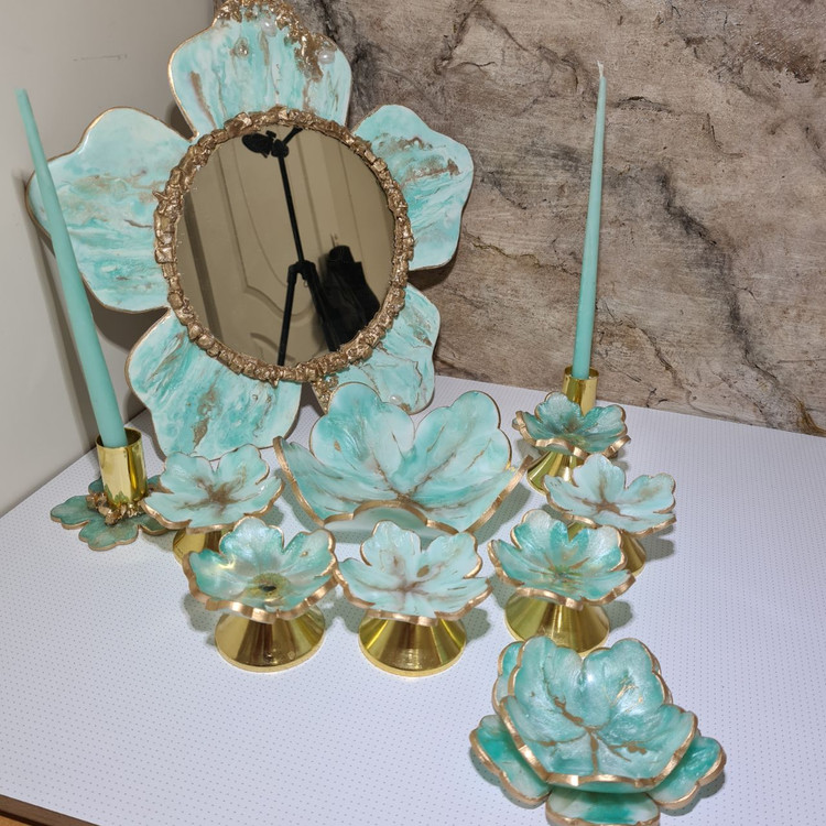هفت سین های رزینی شامل شش عدد پیاله و دوعدد جاشمعی وآینه است.